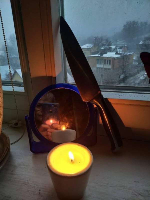 На фото, если приглядеться, можно рассмотреть и саму «мстительницу», которая отражается в зеркале, расположенном вместе с ножом и свечой.