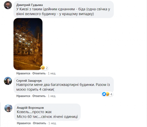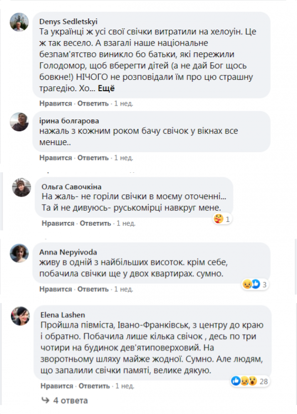 «К сожалению, с каждым годом вижу свечей в окнах всё меньше», «Увы, не горели свечи в моём окружении... Да и не удивляюсь — русскомирцы вокруг меня», «Живу в одной из самых больших высоток. Кроме себя, увидела свечи ещё в двух квартирах. Грустно», «Прошла полгорода, Ивано-Франковск, из центра до конца и обратно. Увидела лишь несколько свечей, где-то по три-четыре на дом девятиэтажный. На обратном пути почти ни одной. Грустно», «В Киеве с таким идейным единением — беда (одна свеча в окне большого дома — в лучшем случае)», «Напротив меня два многоквартирных дома. Вместе с моей горит 4 свечи», «Ковель — просто ужас... Город 60 тысяч, свечек — единицы», — значится в комментариях.