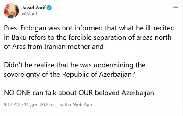 «Неужели он не осознавал, что подрывает суверенитет Азербайджанской Республики? Никто не может говорить о нашем любимом Азербайджане», — подчеркнул Зариф, имея в виду иранскую провинцию.