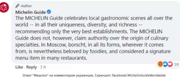 Однако Путеводитель "Мишлен" не претендует на авторитет в отношении происхождения кулинарных деликатесов. В Москве борщ во всех его формах, где бы он ни был, тем не менее, любим гурманами и считается фирменным блюдом во многих ресторанах», — ответили на возмущение украинцев в «Мишлене».