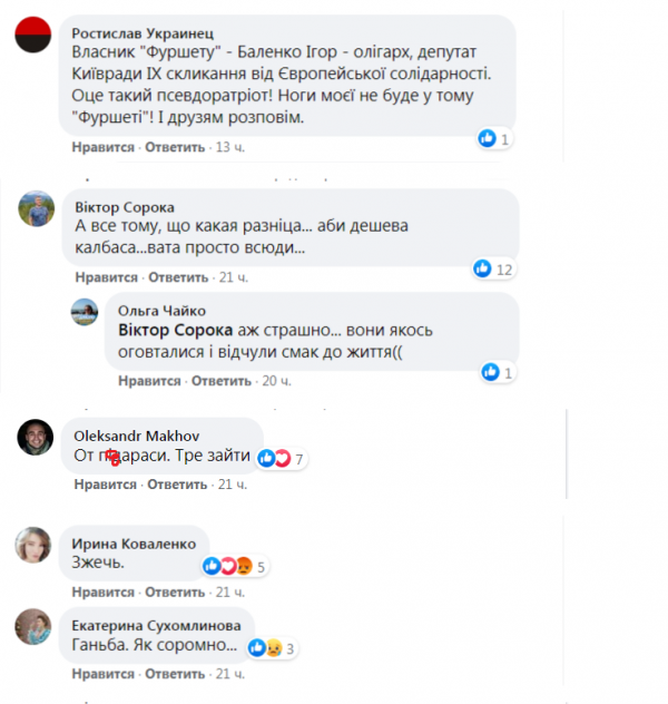«Владелец "Фуршета" - Баленко Игорь - олигарх, депутат Киевсовета ІХ созыва от "Европейской солидарности". Вот такой псевдоратриот! Ноги моей не будет в том "Фуршете"! И друзьям расскажу», - заявил Ростислав Украинец.