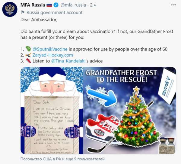 Министерство иностранных дел России пошутило над письмом посла США Джона Салливана к Санта Клаусу, в котором тот попросил вакцину от коронавируса. Русские напомнили, что они снова переиграли американцев с вакциной. Шутка МИДа рискует стать пророческой на фоне проблем с вакцинацией в США.