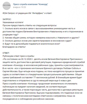 В заключение в пресс-службе «Конкорда» отметили, что они и дальше планируют внимательно следить за деятельностью Навального и Ко, в частности, за их творчеством, чтобы отслеживать лживые материалы, дискредитирующие Пригожина.