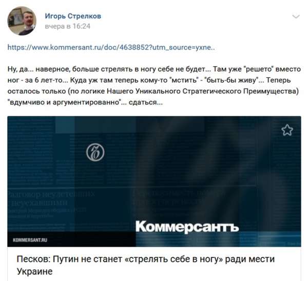 «Ну, да... наверное, больше стрелять в ногу себе не будет... Там уже "решето" вместо ног — за 6 лет-то... Куда уж там теперь кому-то "мстить" — "быть-бы живу"...», — прокомментировал слова Пескова бывший лидер донецкого ополчения, экс-министр обороны ДНР Игорь Стрелков на своей странице в «ВКонтакте».