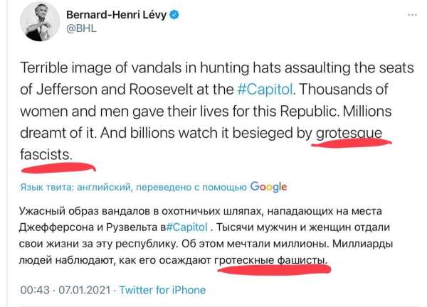 Политолог Владимир Корнилов обращает внимание, как оценил события в Вашингтоне поддержавший госпереворот на Украине французский философ и писатель Бернар-Анри Леви.