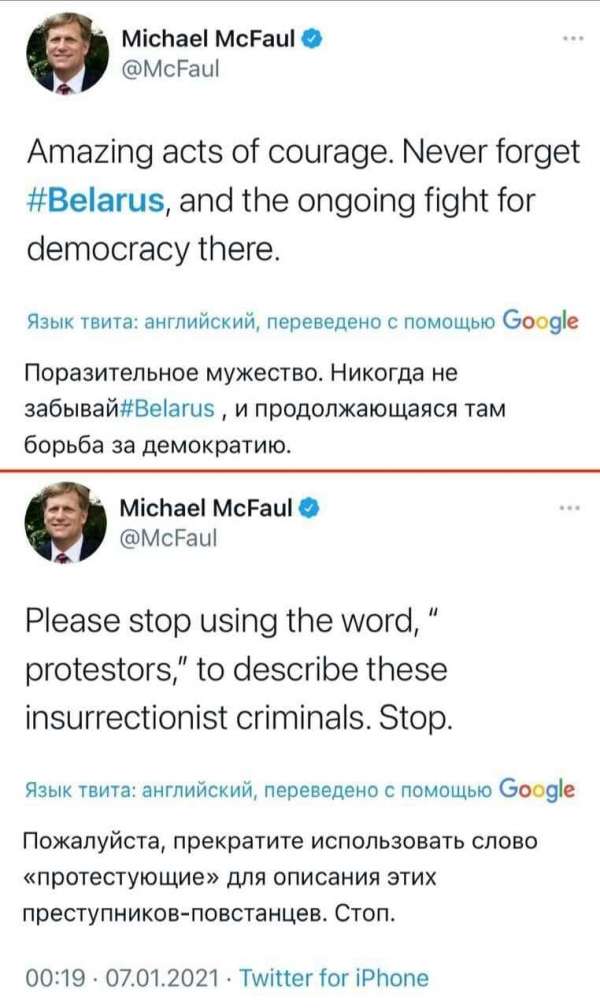 Бывший посол США в России Майкл Макфол удивительно по-разному комментирует события с захватом Капитолия и недавние уличные протесты в Белоруссии. Так, беспорядки в Вашингтоне, по его мнению, осуществляли преступники, а перекрывали дороги в Минске и нападали на милицию – борцы за демократию. В этом можно убедиться, изучив сообщения Макфола в твиттере.