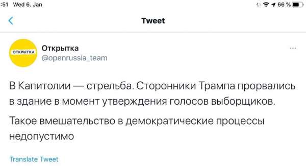 Правда, он тут же обращает внимание на сообщение «Открытки» – организации «Открытая Россия» беглого олигарха Михаила Ходорковского. Там вашингтонский Майдан уже оперативно осудили. «А, вот уже и началось, все ясно. Классическое «это другое», – констатирует Медведев.