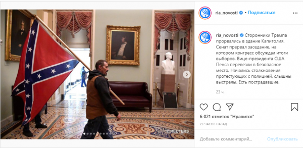 События минувшим вечером в Вашингтоне американские СМИ сравнивают с протестными акциями в Белоруссии после президентских выборов 9 августа 2020 года и даже с государственным переворотом на Украине 2013-2014 годов.