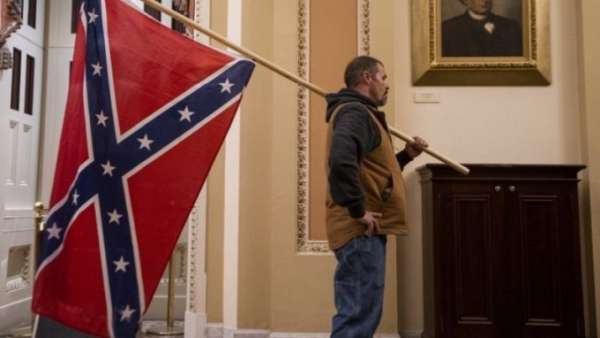Так, один из ворвавшихся в здание сторонников Трампа нес флаг Конфедерации, который демократы в США сейчас буквально заставляют считать символом расизма.