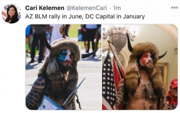 Возьмём того же Джейка Анджели – одного из руководителей штурма Капитолия, шамана движения Q. Он же «Викинг» и ... активный участник движения BLM (эти данные содержатся в статье Майка Адамса «Фальшивый флаг подтверждён: «Викинг», штурмовавший здание Капитолия, ранее сфотографировался на митинге BLM», Natura News, 06.01.2020).