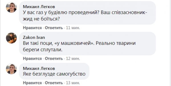 «У вас газ в здание проведен? Ваш соучредитель-жид не боится?», - интересуется некий Михаил Легков, добавив также многозначительное «какое бессмысленное самоубийство».