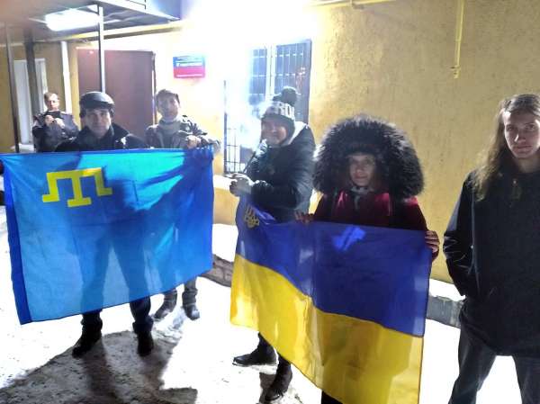 У отделения полиции задержанных собралась поддержать группа единомышленников, развернувших флаги Украины и меджлиса.