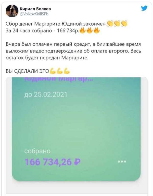 27 января пришло новое сообщение. Кровавый режим оказался настолько кровавым, что через мундепов и общественность собрал 167 тысяч рублей для погашения кредита Юдиной перед банками с передачей остатка на руки бестолковой мамаше.
