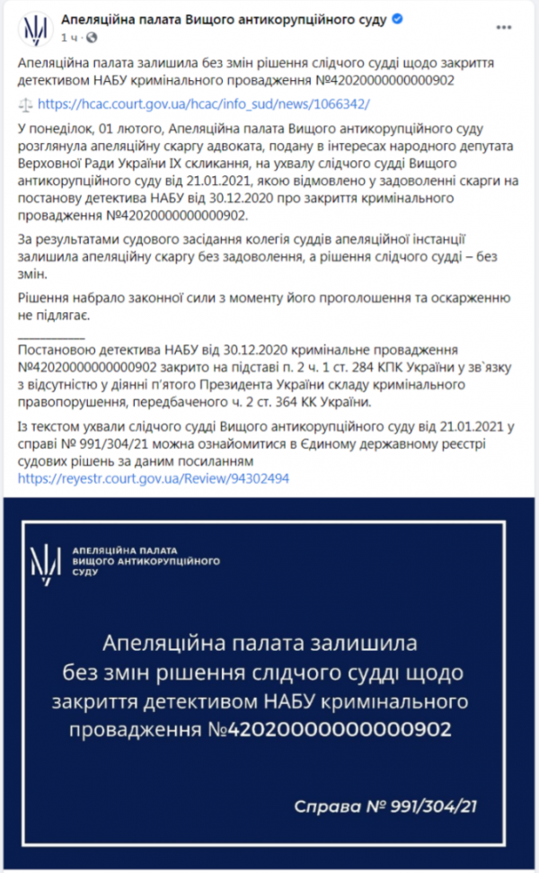 «Апелляционная палата Высшего антикоррупционного суда рассмотрела апелляционную жалобу адвоката, поданную в интересах народного депутата Верховной Рады Украины IX созыва, на решение следственного судьи Высшего антикоррупционного суда от 21.01.2021, которым отказано в удовлетворении жалобы на постановление детектива НАБУ от 30.12 .2020 о закрытии уголовного производства», — говорится в сообщении.