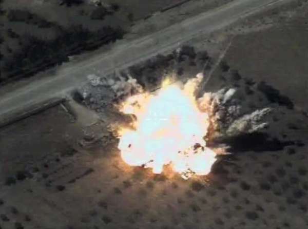 Фронтовой бомбардировщик Су-24 уничтожил подземное укрытие террористов вместе с техникой.