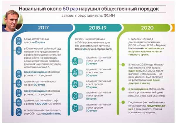 Возможно, такая мягкость отечественного правосудия привела блогера к мысли, что ему позволено все. А потому он, грубо говоря, принялся нарушать закон на каждом шагу. По словам представителя ФСИН, с 2017 по 2020 год Навальный нарушил общественный порядок более 60 раз.