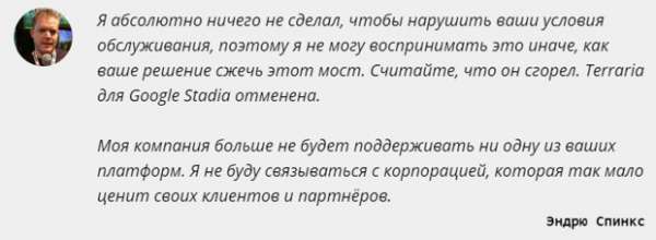 В ответ Спинкс отменил релиз Terraria для Google Stadia. Спинкс дополнил в заявлении, что Re-Logic больше никогда не будет поддерживать Google-платформы, потому что он «не хочет связываться с корпорацией, которая не ценит своих клиентов и партнеров». В Terraria играют более 30 миллионов человек.