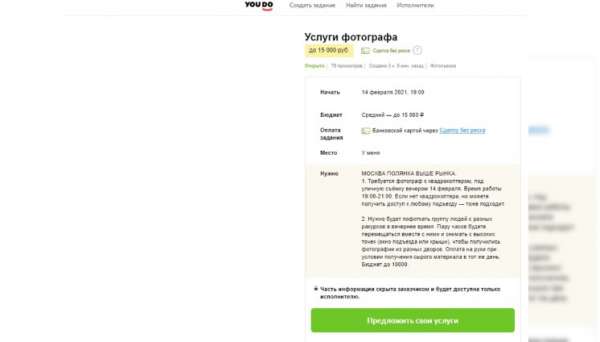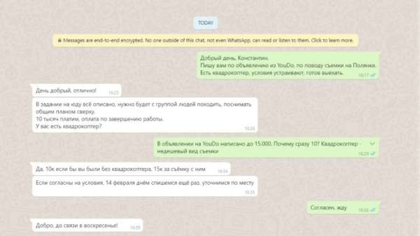 Журналисты нашли объявление на сайте YouDo с предложением 15 000 за съемку с квадракопретом. Молодой человек по имени Константин сразу же попытался обмануть корреспондента, написавшего ему ради интереса, предложив тому 10 000.