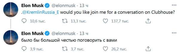 «Не согласитесь ли вы присоединиться ко мне в Clubhouse?» — написал он, добавив на русском: «Было бы большой честью пообщаться с вами».