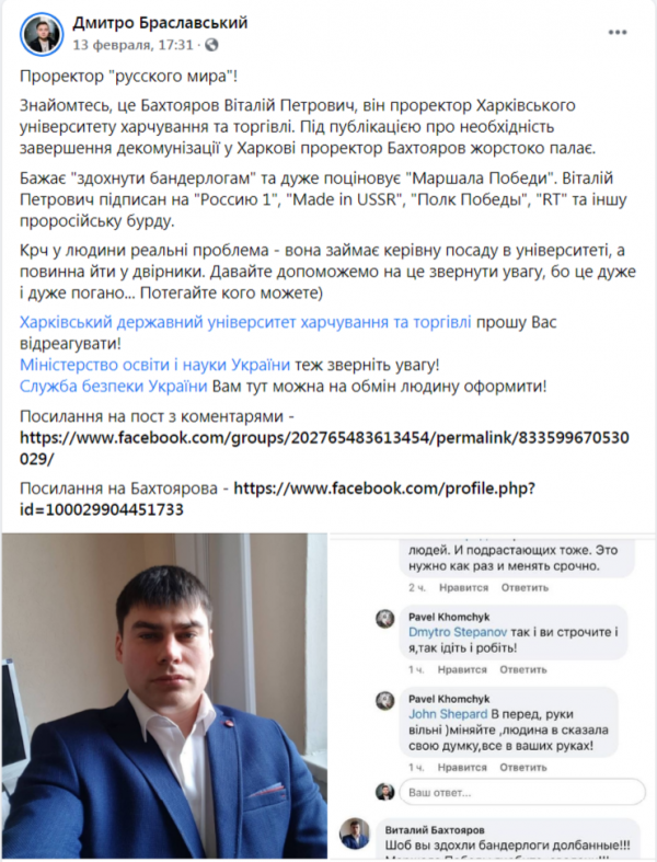 В Харькове проректор Университета питания и торговли Виталий Бахтояров оказался мишенью для атаки «сторонников декоммунизации», которых он имел неосорожность оскорбить в социальной сети, назвав их «бандерлогами» и пожелав «сдохнуть».
