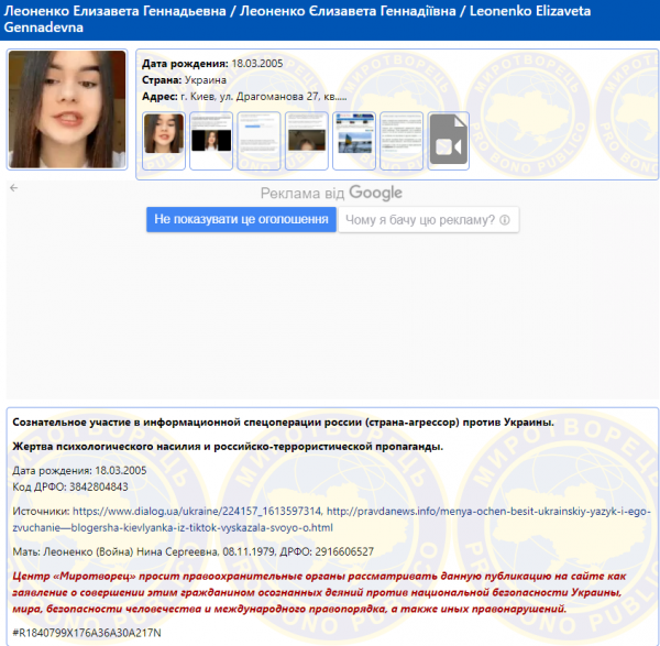 Тем временем, личные данные Елизаветы и ее родителей уже опубликованы на сайте проекта «Миротворец». Школьницу обвиняют в «сознательном участии в информационной спецоперации России против Украины»...