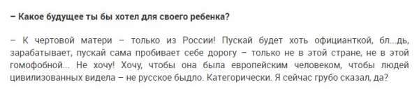 К сожалению среди актерской среды таких много, очень много... это яркий пример того, как лицедеи, наркоманы и проститутки позволяют себе рассуждать о том, что нужно России...забывая, кто убирает улицы, подает в дома свет, тепло и газ, кто убирает за ними в гостиницах, кто строит всё...