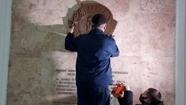 Сотрудники горсовета вернули изображение ордена Ленина на место.