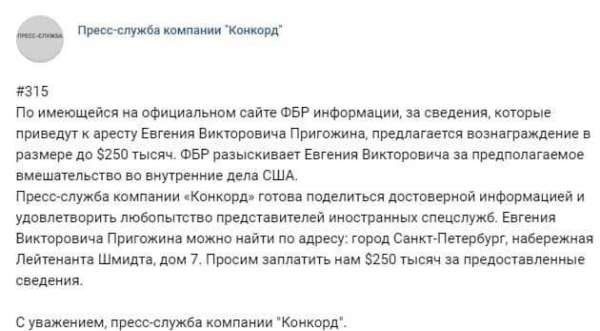 Пресс-служба компании Евгения Пригожина «Конкорд» сообщила его адрес ФБР, потребовав от американцев обещанное вознаграждение. Ранее американская сторона распространила заявление, в котором пообещала награду тому, кто сообщит достоверную информацию о местонахождении бизнесмена.