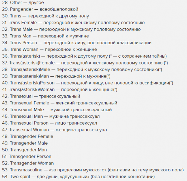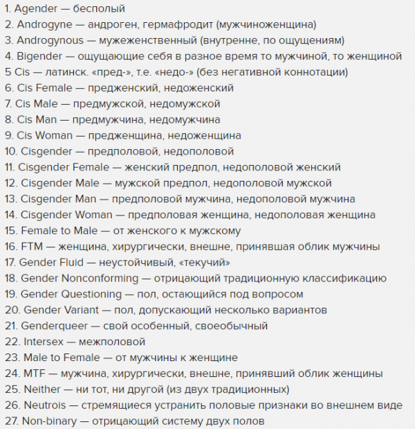Вообще странно, что Запад все еще продолжает делить что-то на мужское и женское. Скоро дети вообще не будут понимать, кем они уродились: вырастут до пубертата в семье с мамой MTF и папой Trans Male, а потом выберут себе один из 54 гендеров. Да, ранее Facebook и ЛГБТ-активисты составили полный список наименований гендерной идентичности, который включил в себя немного-немало 54 определения.