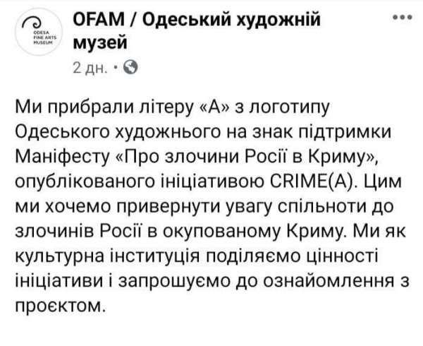 Такой себе флешмоб грантоедов, которые «Пишичитая» не читали и не смотрели — в частности, выпуск о том, как буква «К» на безграмотного мальчика Колю обиделась, превратив его в Олю, окно, в оно, а клен в лён. И коллектив музейщиков выдал: «Мы убрали букву «А» с логотипа Одесского художественного музея в знак поддержки Манифеста «О преступлениях России в Крыму». Этим мы хотим привлечь внимание общественности к преступлениям России в оккупированном Крыму. Мы как культурная институция разделяем ценности инициативы».