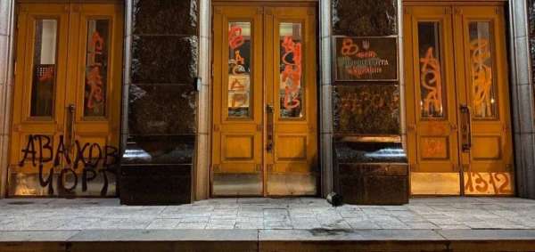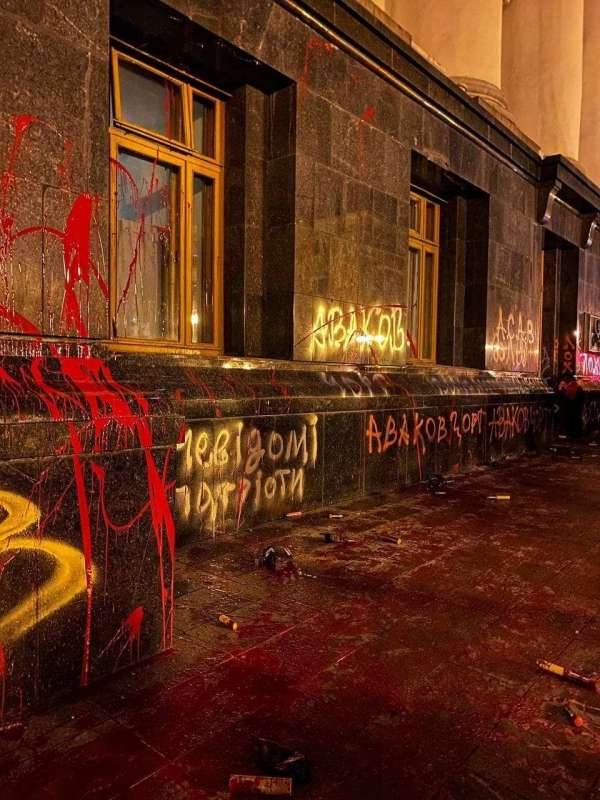 Прорвавшись на крыльцо здания Банковой, радикалы обрисовали стены надписями «Волю Стерненко» и «Аваков-чёрт!», после чего кто-то под табличкой «Президент Украины» люминесцентной краской написал «ЛОХ». Также майданщики рисовали аббревиатуру A.C.A.B.(All cops are bastards – «все полицейские – ублюдки», – ред.) Под грохот петард националисты начали бить дверные стёкла и поджигать двери. Кроме того, пылала облитая горючим и надпись «Президент Украины».