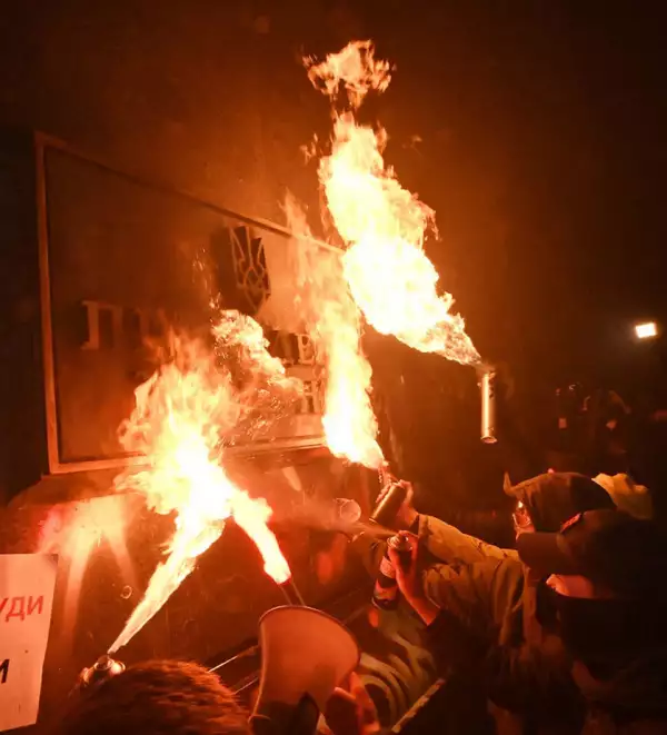 Демонстранты направились к офису президента Владимира Зеленского, где забросали пиротехникой полицейских, охранявших здание, разгромили вход в офис, разбили окна, забросали здание фейерверками, нарисовали на стенах оскорбительные надписи в адрес главы государства и министра внутренних дел. Они требовали отставки генпрокурора Арсена Авакова и генпрокурора Ирины Венедиктовой.