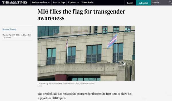 Чрезвычайно комичный, по нашим оценкам, материал вышел на страницах знаменитой лондонской Times. Шерлока Холмса, известного своим вниманием к этой газете, хватил бы удар, если бы он увидел такой материал. Times пишет, что офис британской разведки МИ-6 официально поднял над зданием флаг трансгендеров.