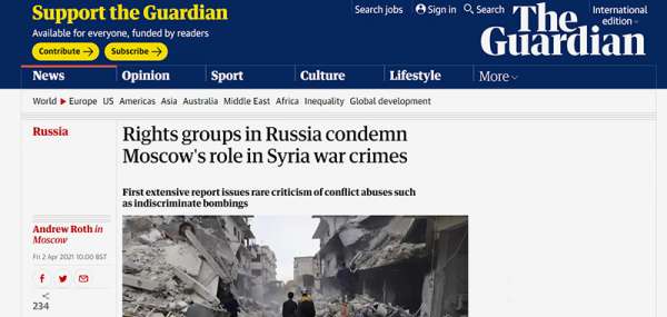 Британское издание Guardian пишет, что в "расследовании", проведённом "группой российских неправительственных организаций", задокументировано применение незаконных задержаний, пыток, изнасилований и "неизбирательного применения оружия" со стороны сирийского режима и России.