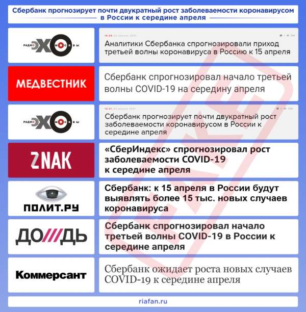 Либеральные СМИ вот уже год с небольшим никак не могут отказаться от такой удобной для грязных инсинуаций темы как борьба с коронавирусом в РФ. Русофобов бесят успехи России в борьбе с пандемией и количество фейков растёт в геометрической прогрессии от числа побед на поле стабилизации ситуации с COVID-19. На этой недели одним из самых матёрых и тупых фейков стал вброс «Эха Москвы» о том, что Сбербанк якобы прогнозирует рост числа заболевших как минимум вдвое уже к середине апрели. Радостную для всех врагов РФ новость мигом разнесли все либеральные издания вроде «Дождя», того же «МБХ» и «Знака» с «Коммерсантом». Не успокоило русофобскую вакханалию и официальное опровержение Сбербанка. Фейк-то уже выдан и отрабатывают его несмотря на абсурдность самой новости.
