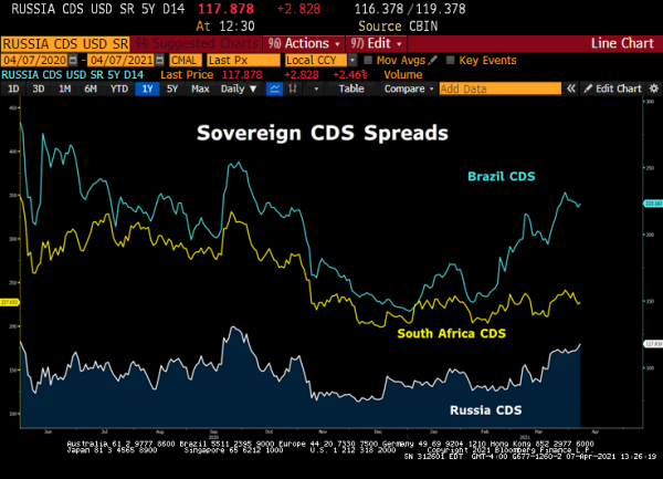 До сих пор существуют некоторые свидетельства того, что дополнительный риск оценивается в рисковые активы. Стоимость защиты от дефолта по российскому суверенному долгу занижена. Южная Африка и другие страны с формирующимся рынком, но не Бразилия.