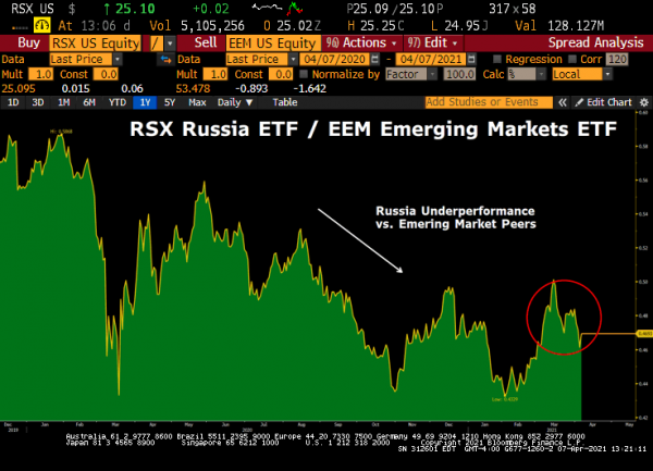 Очевидно, что здесь идет речь о каком – то украинско-российском конфликте. Обратите внимание на недавнюю недооценку российских акций RSX по отношению к материнскому кораблю EEM.
