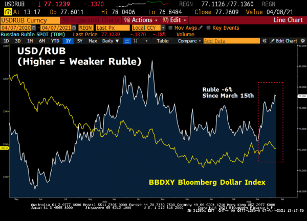"медвежьи ловушки" мы всегда ищем подсказки – по всем классам активов – чтобы подтвердить или опровергнуть постоянный и часто неприятный поток новостей в ежедневнонедельном цикле. Кредитный риск очень важен, но взгляд в сторону волатильности валюты – цены, которую кто – то готов заплатить за ставку в том или ином направлении, - является ключевым мерилом для мониторинга. Обратите внимание выше, насколько слабее рубль торговался в последнее время по отношению к широкому индексу доллара Bloomberg.
