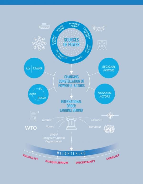 Ротация центров силы, вероятно, сформирует более нестабильную и конфронтационную «геополитическую среду́» и увеличит разрыв между «транснациональными вызовами» и механизмами сотрудничества для их решения. Соперничающие державы будут бороться за «формирование глобальных норм, правил и институтов». США вместе со своими союзниками и Китай будут иметь наибольшее влияние на глобальную повестку, выражая «конкурирующие взгляды» на международную систему и управление, отражающие «их основные интересы и идеологии». Это соперничество затронет большинство областей межгосударственного взаимодействия, в некоторых случаях изменяя существующие сейчас альянсы и реформируя международные организации, которые до этого «десятилетиями поддерживали международный порядок».