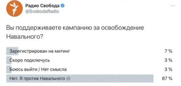 Уже не говоря о том, что на Навального наплевали даже либералы. Согласно опросу «Радио Свобода», против него выступает 87% проголосовавших. Его выходки противны даже тем, кто вместе с ним служит Западу.