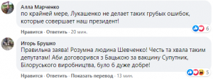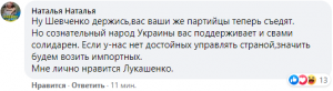 Украинцы опасаются, что слова о рейтинге Лукашенко могут осложнить работу Шевченко в партии «Слуга народа», так как они ставят под сомнение миф о народной поддержке Зеленского. Однако, как отмечают авторы комментариев, это не повлияет на рейтинги украинских политиков. За неимением собственных достойных политических деятелей Украине придется «ввозить импортных», с грустью констатируют жители страны.