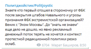 Главный редактор радиостанции «Эхо Москвы» Алексей Венедиктов, пишет политтехнолог Марат Баширов на своем ТГ-канале «Политджойстик», первым отошел в сторонку от ФБК Навального после появления угрозы признания фонда экстремистской организацией в России. Либералу дорого его положение и денежки терять не хочется.