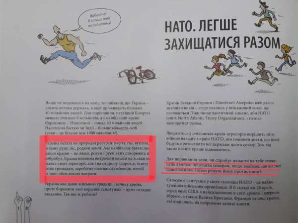 Руководство Украины на протяжении длительного времени проводит информационную кампанию по популяризации идеи вступления в Североатлантичексий союз. Оказалось, что направлена она на все возрастные группы населения, в том числе и детей. Натовская пропаганда процветает на страницах детских книг.