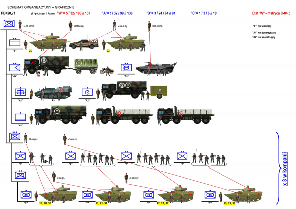 Согласно натовским стандартам, в механизированном взводе предполагается иметь 4 БМП-1, а в роте – 14 (по одной боевой машине у командира роты и его заместителя). Всего в роте будет насчитываться 142 человека. Кроме того, в Войске Польском механизированные батальоны уже осуществили переход на четырехротную структуру. Соответственно, после принятия нового штата роты в батальоне будет в общей сложности 58 БМП-1.