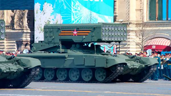 Проедут по Красной площади и машины знаменитой тяжёлой огнемётной системы залпового огня ТОС-1А "Солнцепёк". Известными они стали тем, что являются модификацией ТОС-1 "Буратино", настолько до судорог напугавшей неонацистский генералитет Украины в Донбассе, что он присвоил им название "Чебурашка". Но настоящую славу им принесли войсковые испытания в Сирии, где они показали себя весьма эффективным – и более чем эффектным! – средством уничтожения убежищ и командных пунктов террористов. Ещё бы – когда термобарический боеприпас создаёт облако взрывоопасной смеси, которая затем подрывается, вызывая мгновенную детонацию с выжиганием всего кислорода, резким подъёмом и столь же резким падением давления, ничто живое в таких условиях, извините за тавтологию, не выживает. Так что три человека экипажа способны за минуту уничтожить батальон в его укрытиях (площадь поражения 40 тыс. кв. м) и на расстоянии до 6 км!