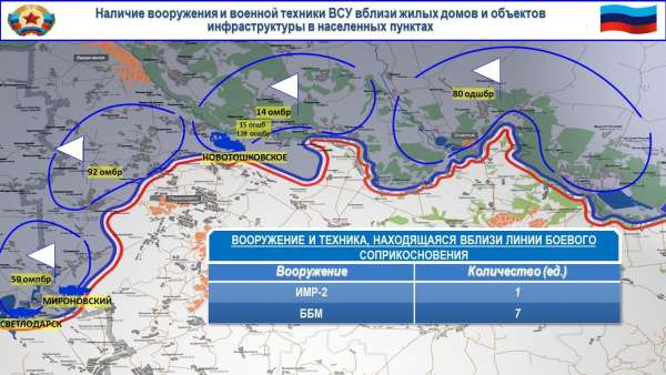 В зоне ответственности 14 бригады отмечается размещение одной боевой инженерной машины ИМР-2 вблизи н.п. Новотошковское. В зоне ответственности 59 бригады — семи боевых бронированных машин вблизи н.п. Светлодарск и Мироновский.