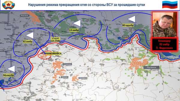 На попаснянском направлении боевики 92-й бригады по приказу комбрига Федосенко подвергли обстрелу район н.п. Первомайск из запрещенного Минскими соглашениями вооружения, применив 82-мм минометы, выпустив 3 мины, также боевики применили АГС и стрелковое оружие.