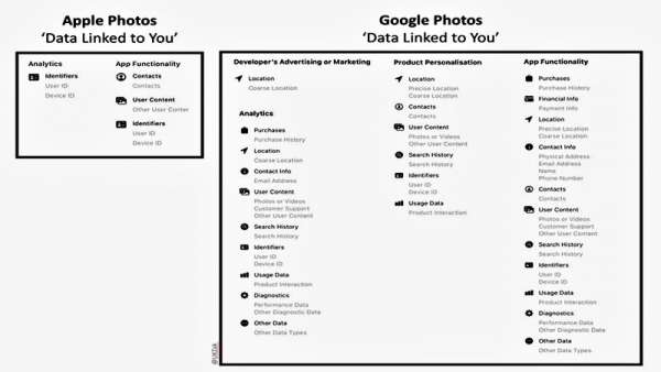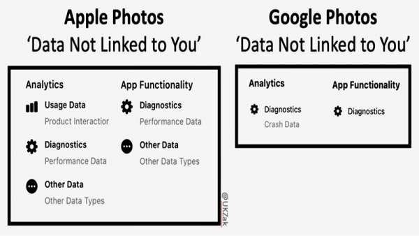 В фотоприложениях Apple и Google разница между такими не связанными с пользователем данными столь же очевидна. Хотя Apple и здесь могла бы добиться большего успеха, единственные данные, которые Google не связывает с вашей личностью, – это диагностика сбоев приложений. Подумайте об этом, – пишет в этой связи эксперт.