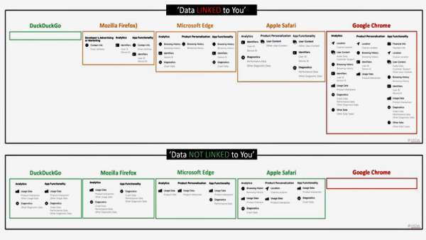 В статье приводится таблица с указанием, какие данные собирают различные браузеры в сравнении с Google Chrome. Верхняя часть таблицы – перечень данных, связанных с личностью человека, в нижней – перечень тех сведений, которые приложение собирает без привязки к личности. Как можно видеть, всё, что собирает Chrome, связано с пользователем.