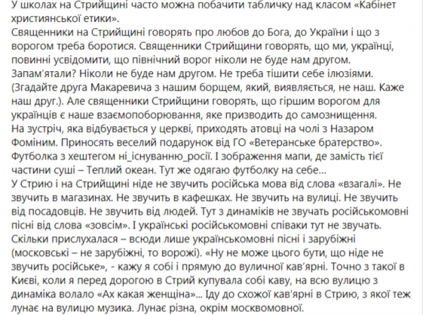 «Священники на Стрыйщине говорят о любви к Богу, к Украине и то, что с врагом надо бороться. Священники Стрыйщины говорят, что мы, украинцы, должны осознать, что северный враг никогда не будет нам другом. Запомнили? Никогда не будет нам другом. Не надо тешить себя иллюзиями. (Вспомните друга Макаревича с нашим борщом, который, оказывается, не наш. Говорит, наш друг)», - пишет Ницой.